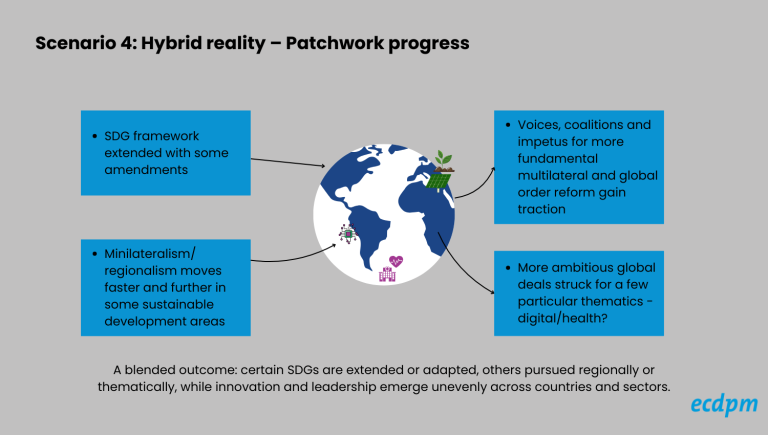 The scenarios for the post-2030 development agenda can be endlessly debated and put together in various ways, with the outcome far from certain. ECDPM has three basic and one more complex scenario, yet all need to be taken with more than a ‘pinch of salt’ and are certainly works in progress. With the current unprecedented global volatility, scenarios aremore ‘food for thought’ than reliable prediction. Europe would have an interest in influencing any scenario, yet if it is divided and distracted and does not reach out then scenarios one or two are much more likely. If it wants to be a player in scenario three or the hybrid scenario four this requires positioning and some political engagement not indifference.