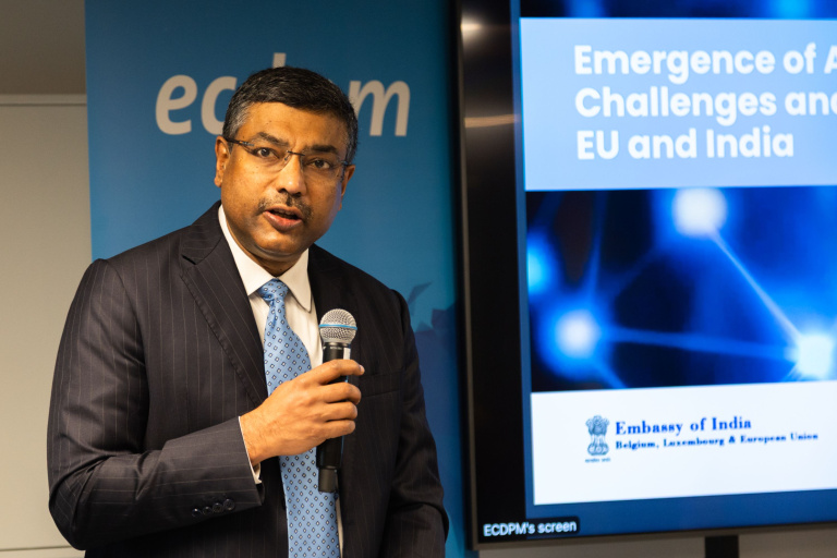 In that spirit, ECDPM convened a first high-level dialogue on EU-India Cooperation on Artificial Intelligence on 31 October, featuring India’s Secretary of the Ministry of Electronics and IT (MeitY), the Indian Ambassador to the European Union, senior officials from the European Commission’s AI Office and DG CNECT, as well as representatives from India’s largest IT company Tata Consultancy Services, Germany’s largest company SAP, and Dutch think tank Clingendael Institute. It was a rainy Friday morning at the start of a school holiday, but that did not prevent a packed room of relevant policy professionals, who were greeted with warm chai and Indian snacks.