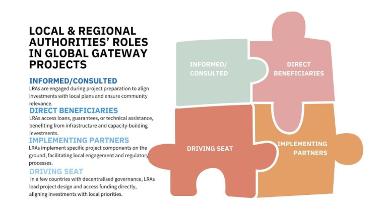 Even in cases where they are not formal partners in a flagship initiative, local authorities frequently play critical roles in complementary or ‘satellite’ interventions under the Global Gateway’s ‘360-degree approach’. These range from climate-resilient urban planning linked to energy infrastructure, to digital governance initiatives supporting connectivity investments, to local service delivery reforms that strengthen the enabling environment for larger EU-backed pipelines.