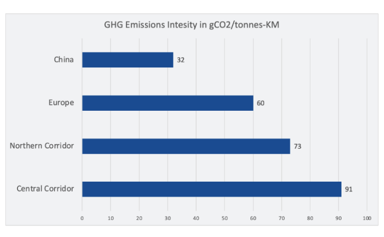 Emission intensities on the Northern (and Central) corridor nonetheless remain higher than in China and Europe, as illustrated in the Figure below. Estimates of GHG emissions on the Northern Corridor put these at 1.72 MMtCO₂e (million metric tons of carbon dioxide equivalent), above that of the Central Corridor that runs through Tanzania, estimated to be 1.24 MMtCO₂e.